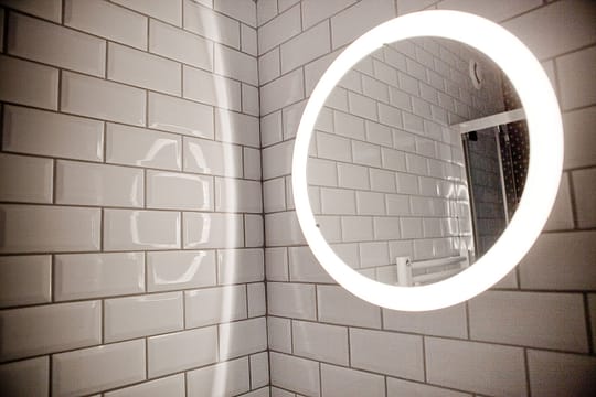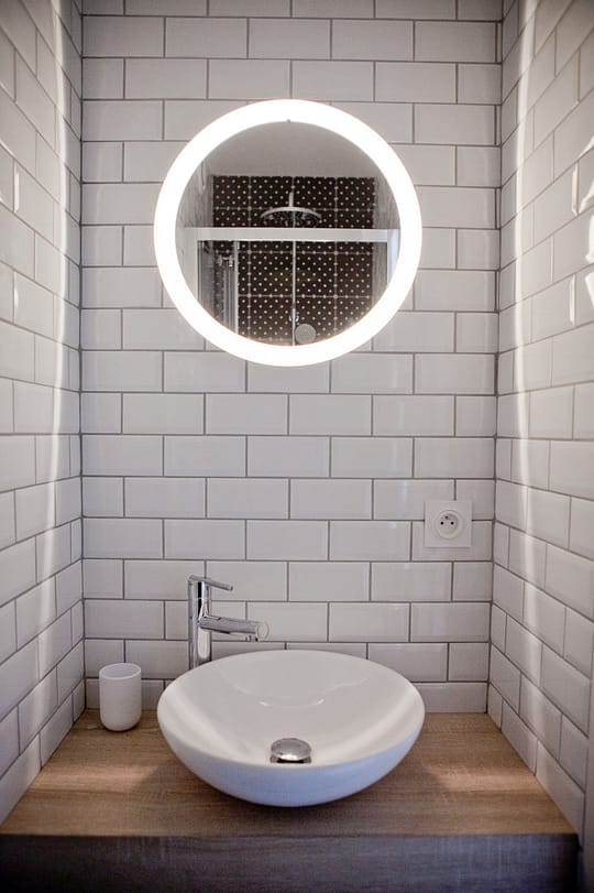 Le reste des murs sont en pavés métro blanc, apportant de la clarté dans cette mini salle d’eau sans fenêtre.