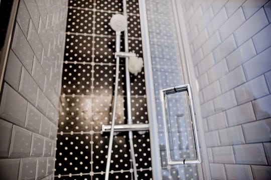 La micro salle de bain attenante est quant à elle dans une ambiance rétro, grâce à un très joli carreau de ciment PETIT PAN en plumetis noir et blanc, au sol et dans le fond de la douche.