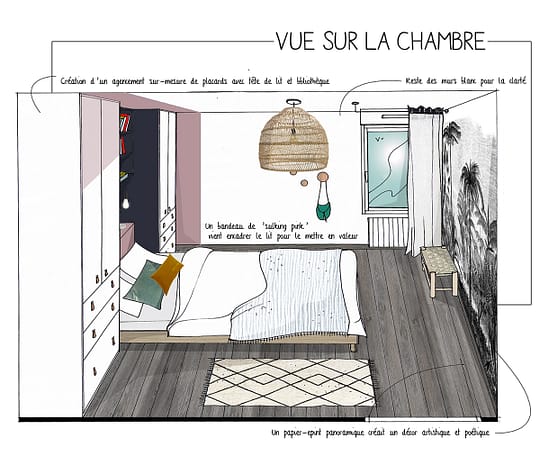 Dans la chambre: Papier peint « Oasis » de chez Au fil des couleurs.