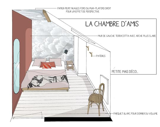 Les papier-peints de chez Isidore Leroy, les Dominotiers et Photowall, viennent planter un décor poétique et mettre en scène certains espaces, comme le coin repas avec sa longue banquette et les têtes de lit de 2 chambres.