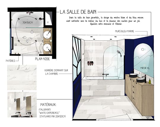 Dans la suite parentale, la salle de bain a été ouverte sur la chambre par une verrière au motif apaisant de coucher de soleil…