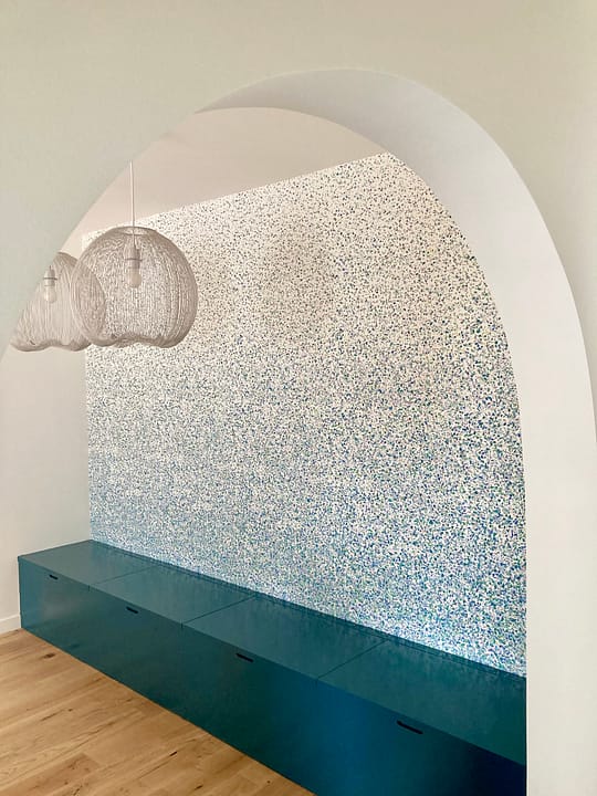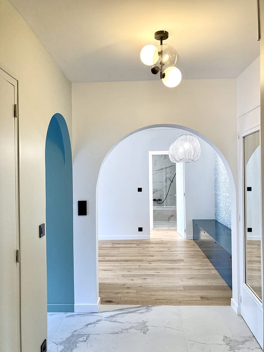 Le charme de l’ancien n’était pas vraiment au rendez-vous, alors nous l’avons recréé en dessinant ces 2 grandes arches visibles dès l’entrée pour une impression de douceur, et le grès cérame effet marbre au sol, vient également souligner la touche rétro.
