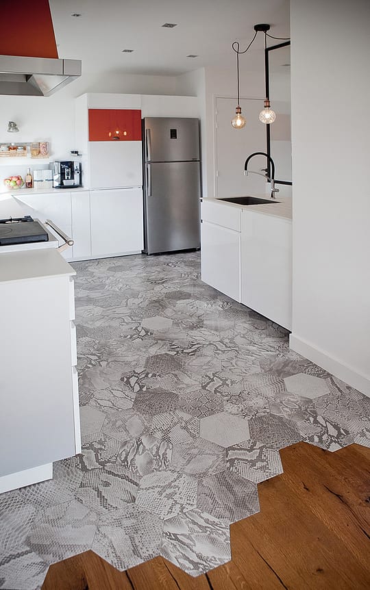 La délimitation entre les différents espaces a été estompée par le mélange entre le sol en parquet et les carreaux hexagonaux aux motifs reptiles.